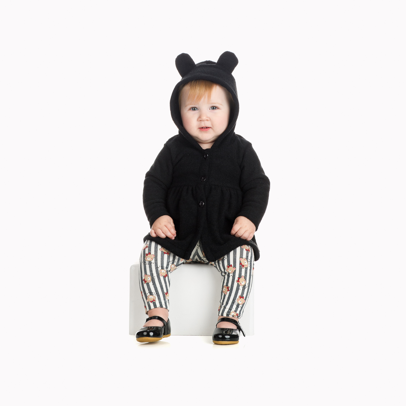 O capuz com orelhinhas interativas transforma o conjunto em um look cheio de personalidade.