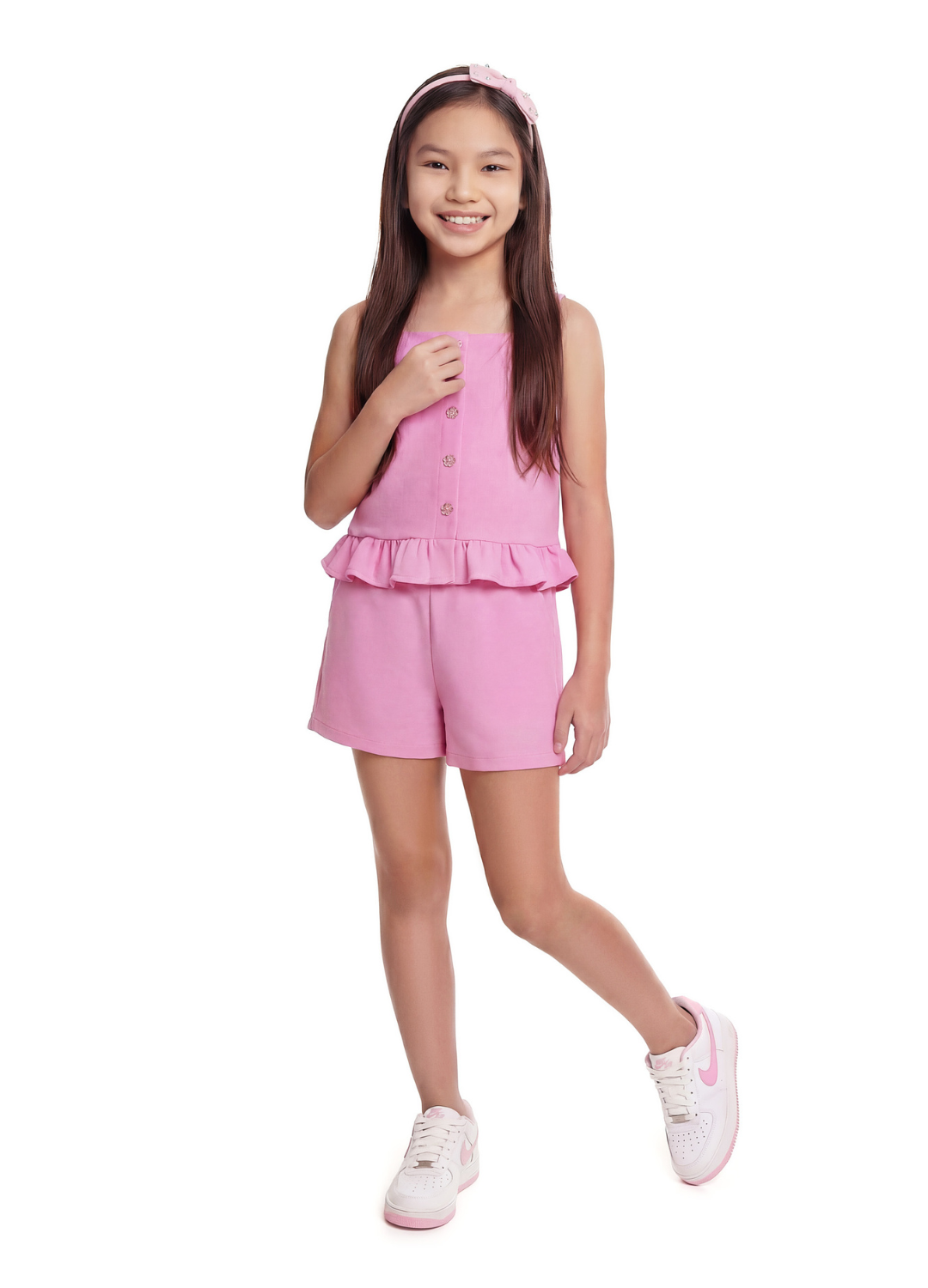 O conjunto em cotton para meninas traz conforto no vestir com um visual leve e encantador. Os botões de margarida entram como destaque, adicionando um toque lúdico.