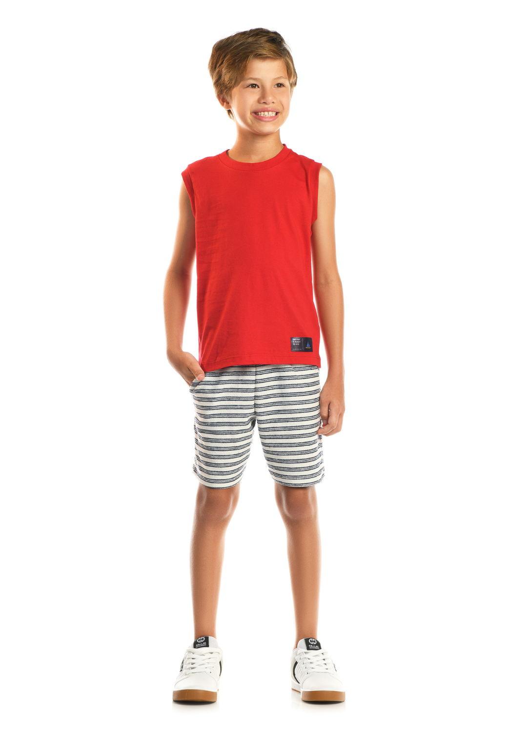 O conjunto em meia malha com moletinho listrado para meninos ganha ainda mais funcionalidade com o shorts com bolso, prático e cheio de estilo. As listras trazem movimento ao look, enquanto o conforto acompanha cada momento do dia.