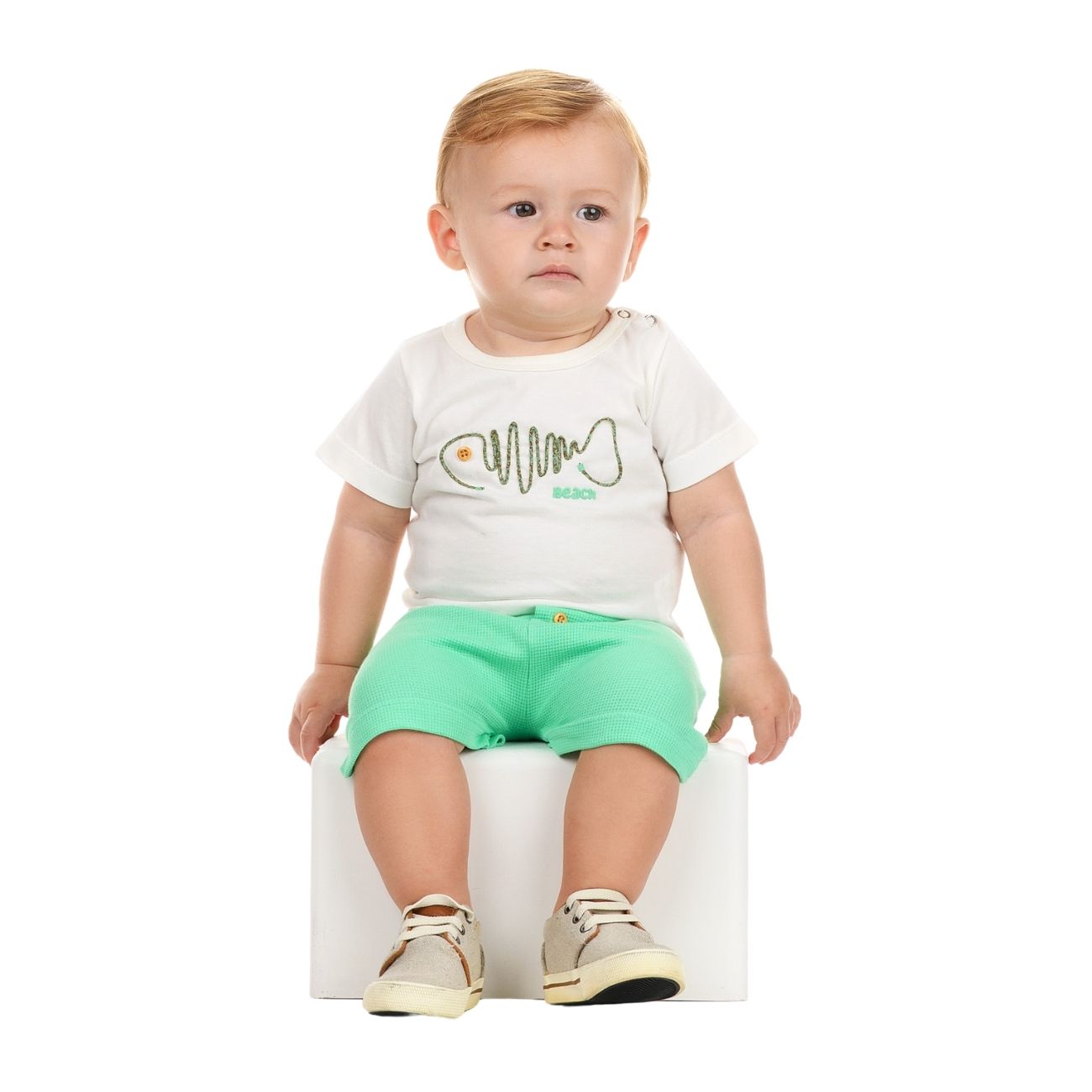 Um conjunto cheio de detalhes que fazem a diferença: blusa em meia malha com bordado e botão de pressão para facilitar o vestir, combinada com bermuda em malha favo e botões de madeira que trazem um charme especial.