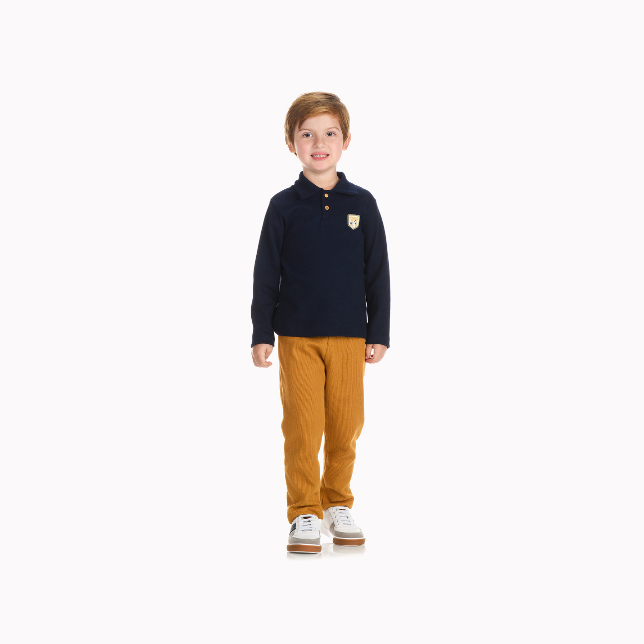 Casaco com botões de madeira e calça com cadarço para vestir fácil e com muito charme.