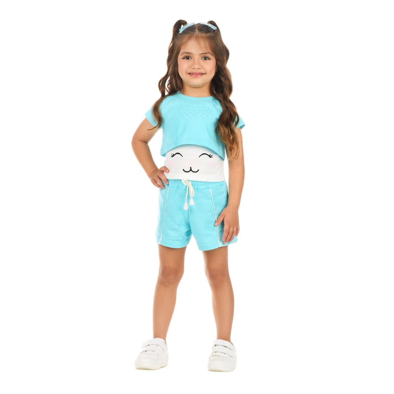 Delicado e moderno, o trijunto vem com blusa em meia malha que traz uma estampa fofa e detalhe em strass, adicionando brilho sutil. O shorts em moletinho com cadarço oferece ajuste confortável, completando o visual com charme e praticidade.
